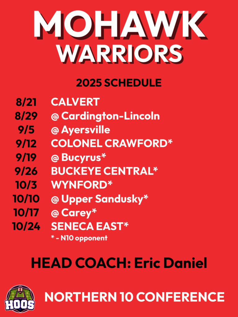 Head coach Eric Daniel is coming off a season where he was awarded all-district co-coach of the year as well as the N10 coach of the year. If Daniel and the Warriors want to repeat as N10 champions, they’ll have to run the table against all of their key game opponents—which they did last season. The season opener with Calvert will also be a good measure of how the 2025 campaign will shape out for Mohawk.